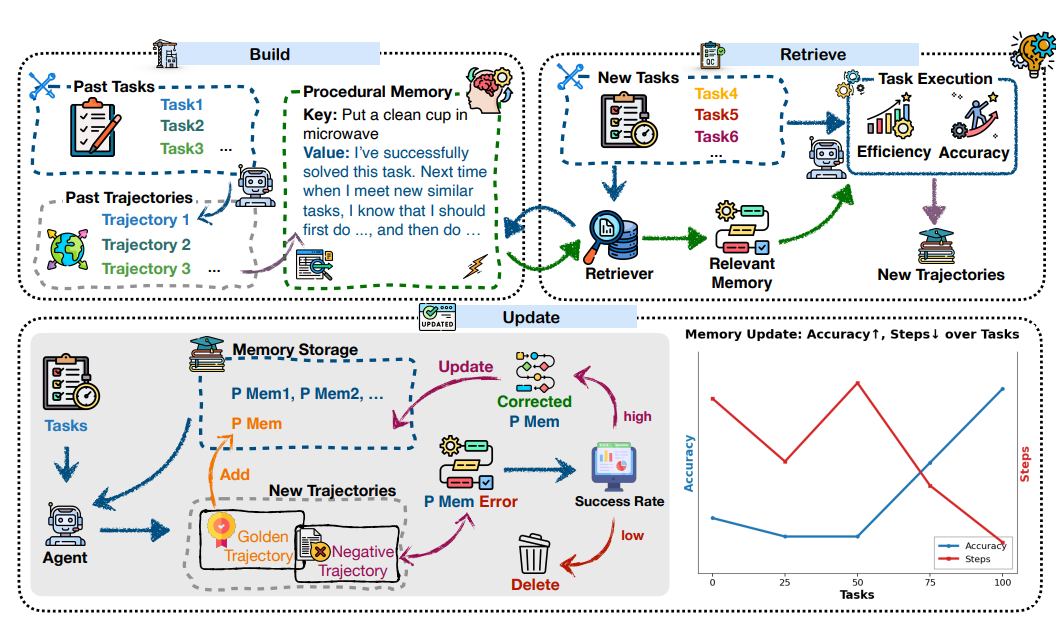 Memp设计了一个三阶段的循环机制。首先是构建阶段,系统从agent过去的行为轨迹中提炼记忆,既可以存储为细粒度的逐步操作指令,也可以抽象为高层次的脚本式表示。然后是检索阶段,当面对新任务时,agent会搜索记忆库找出最相关的过去经验作为起点,这比随机尝试要高效得多。最后再是更新阶段,agent可以反思失败案例,修正和修订原始记忆。