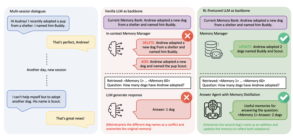 系统包含两个专门的agent。Memory Manager负责学习执行结构化的记忆操作,包括添加、更新、删除或保持不变。Answer Agent则实现了一个"记忆蒸馏"策略,从检索到的大量记忆中筛选出最相关的部分用于回答。这两个agent都通过PPO和GRPO算法进行outcome-driven的强化学习训练。