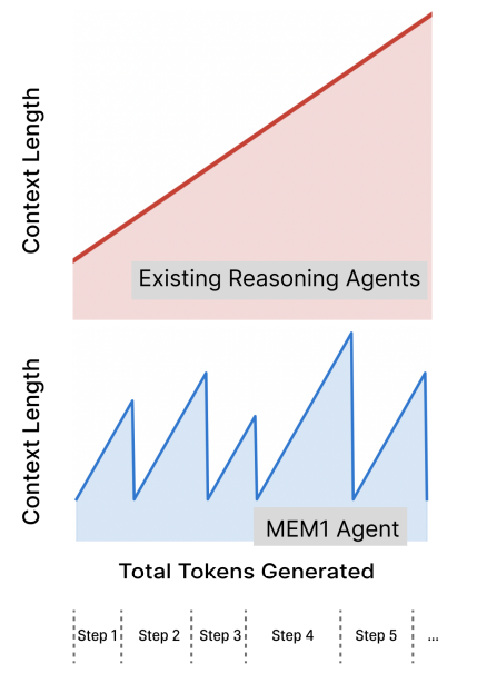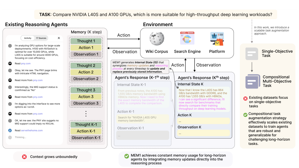 MEM1的一个创新点是把推理本身视为"工作记忆"。在与环境交互的过程中,agent的推理链会提取关键信息,构建对问题的演进理解。使用XML风格的标签来显式标注不同组件:用表示内部推理状态,表示向环境的查询,表示agent的回答,表示外部观察结果。通过迭代的状态更新,MEM1只保留最新的完整状态集合,旧的工具输出则可以丢弃(anthropic也有类似的上下文维护策略),有效减轻上下文增长压力。