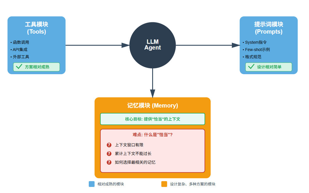 在实际搭建agent项目时,工具模块,记忆模块,提示词模块是三个重要的基础模块。工具模块和提示词模块相对简单或者说比较成熟的方案,而记忆模块的搭建则有不同的设计思路和实现方式,但核心思路一致 - "给agent提供恰当的上下文",但难就难在"恰当",首先受限于LLM的上下文窗口,所以累计上下文就不能过长。