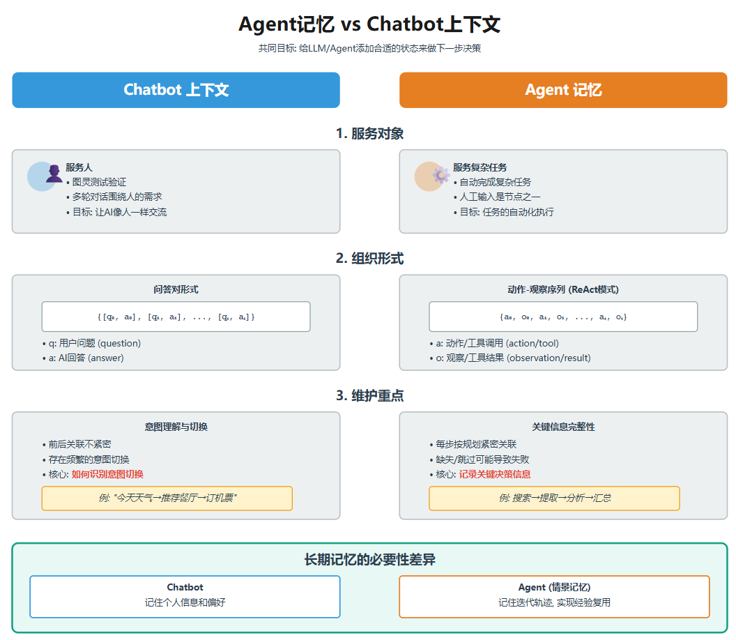 agent记忆和chatbot上下文的目标看上去是一致的:给LLM/agent添加合适的状态来做下一步的决策。但是从服务对象,组织形式和维护重点的扩展来看有比较大的区别。