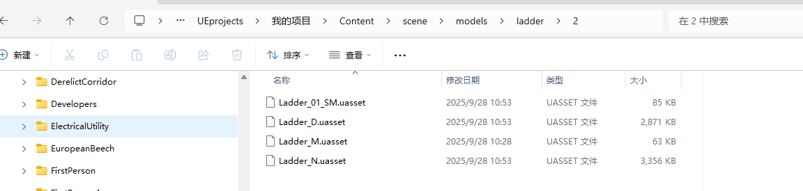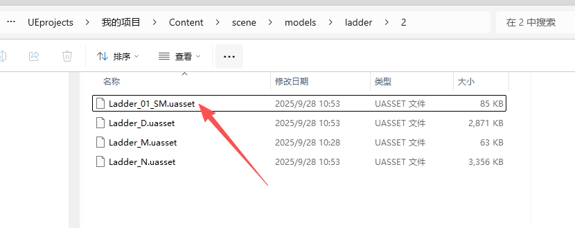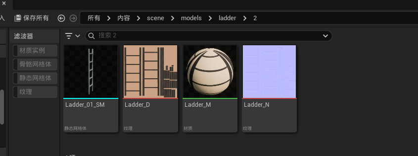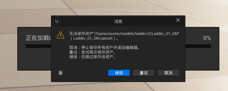 当去内容游览器中 比如 “/Game/scene/models/ladder/2” 下检查 “Ladder_01_SM” 文件时。能够发现“Ladder_01_SM” 文件确实消失了。这时候将“Ladder_01_SM” 文件从外部再次导入到“/Game/scene/models/ladder/2”中时。会发生无法保存资产的问题。