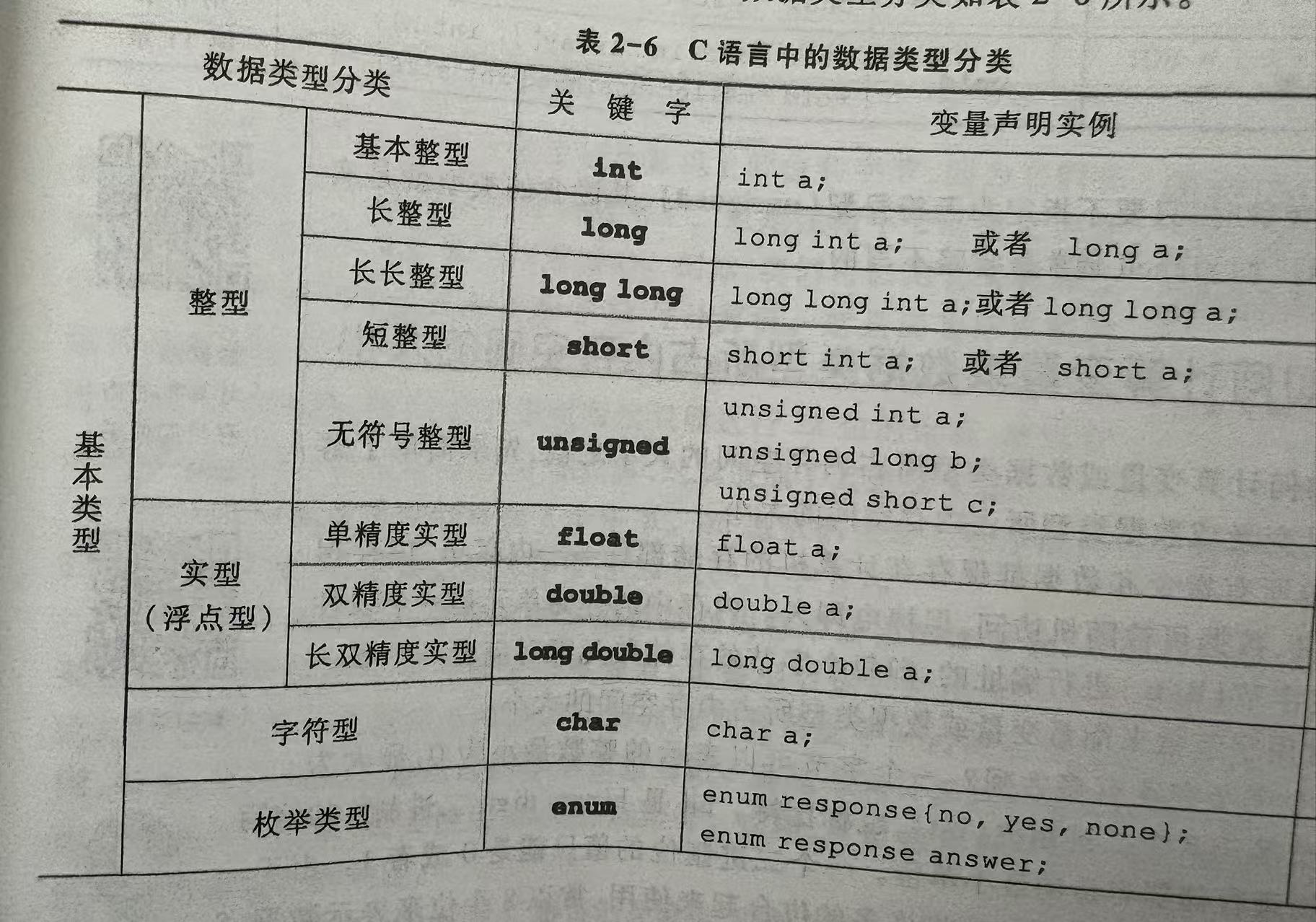 关键字(Keyword)是C语言预先规定的、具有特殊意义的单词(详见附录A)。这里的类型关键字用于声明变量的类型。变量的类型决定了编译器为其分配内存单元的字节数、数据在内存单元中的存放形式、该类型变量合法的取值范围以及该类型变量可参与的运算种类。
