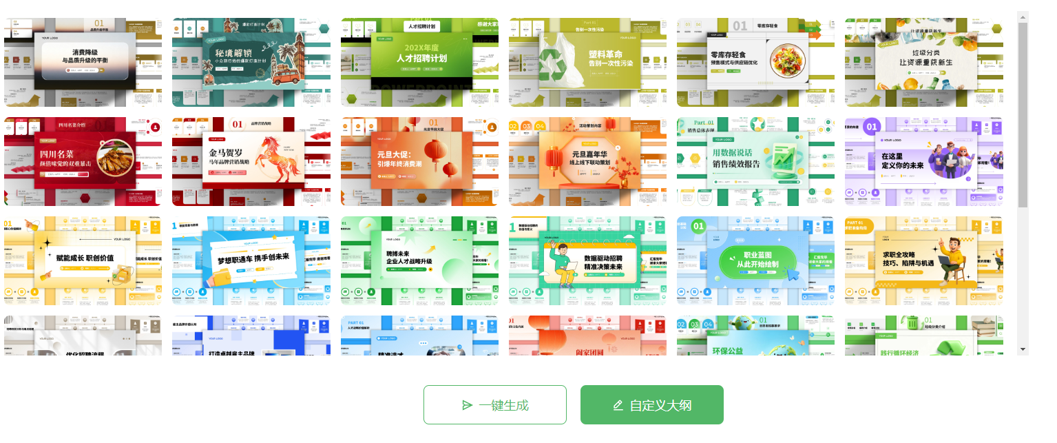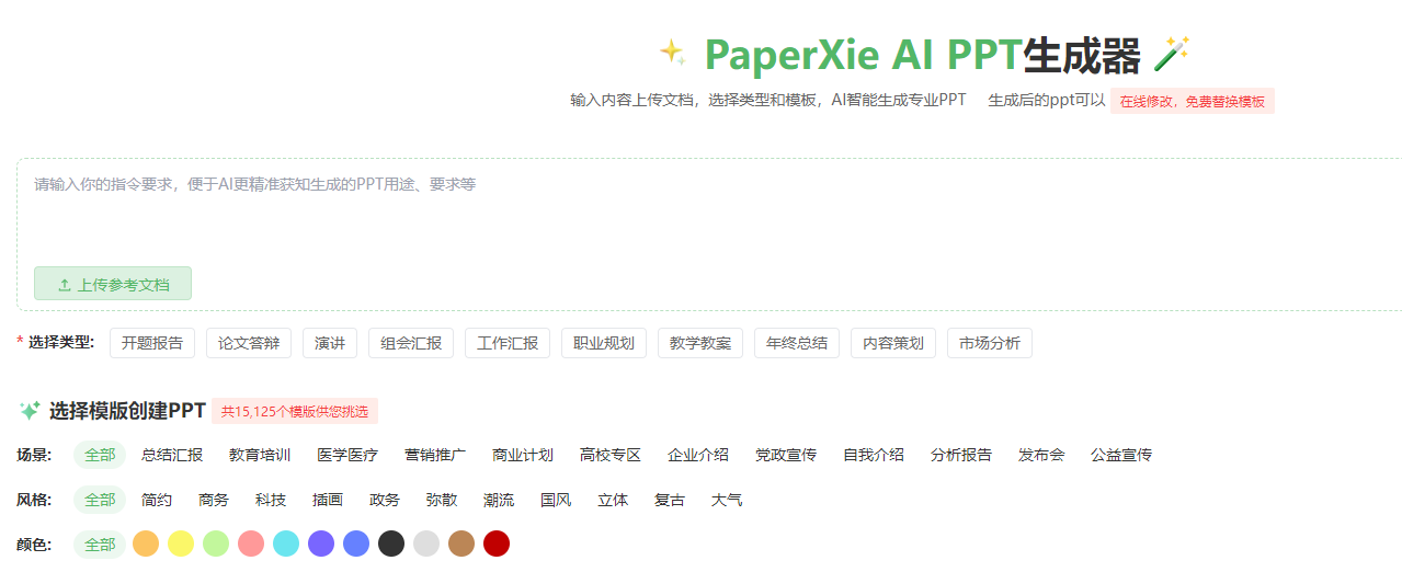 - 海量模板与智能适配:PaperXie 内置 15,074 个覆盖多场景、多风格的模板库,细分 “总结汇报、教育培训、医学医疗、营销推广” 等十余类应用场景,同时提供 “简约、商务、科技、国风” 等多元设计风格选择。模板搭配标准化色彩方案与版式设计,确保不同行业、不同主题的 PPT 都能获得契合的视觉表达。