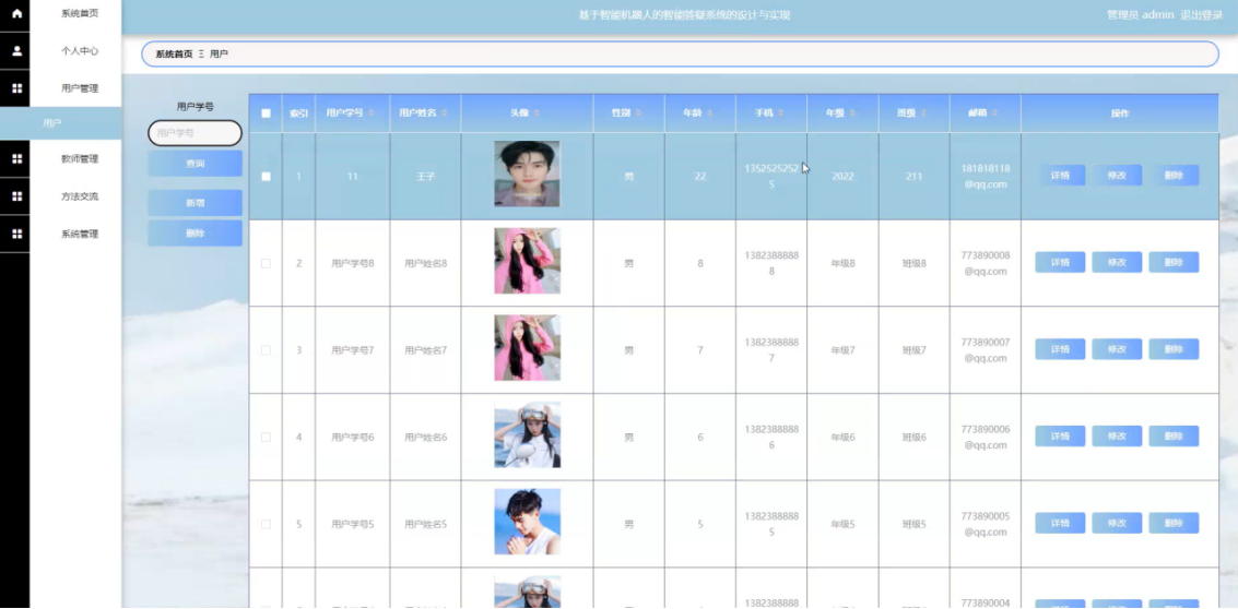 管理员点击用户管理,在用户管理页面中输入用户学号、用户姓名、头像、性别、年龄、手机、年级、班级、邮箱等信息,进行查询、新增或删除用户信息等操作。如图5-8所示: