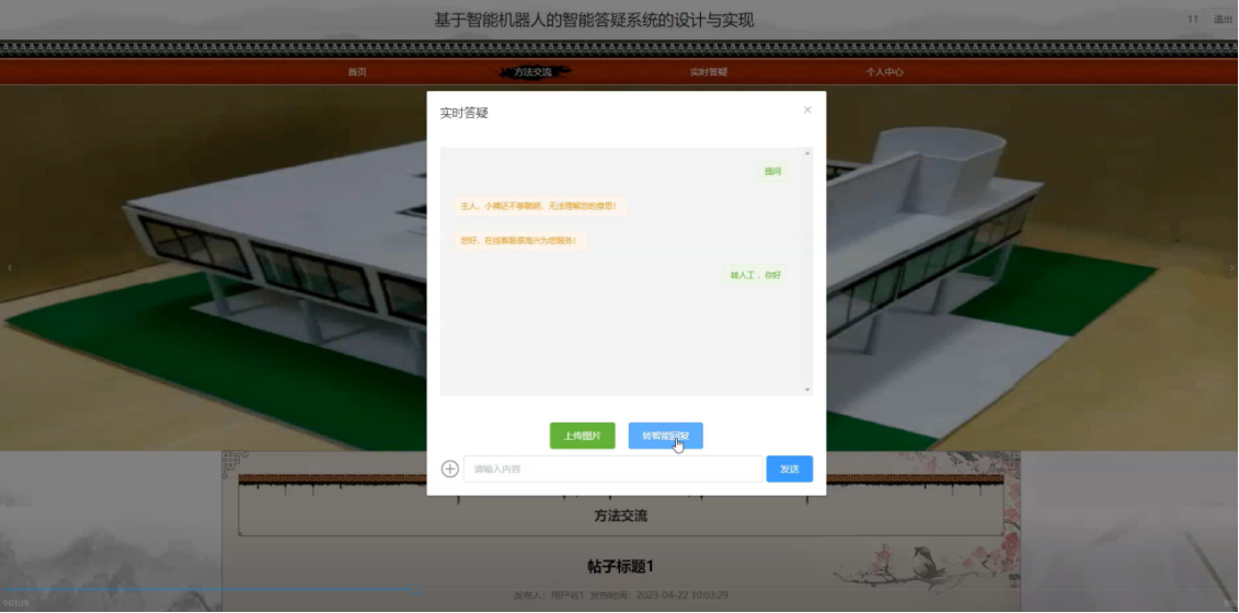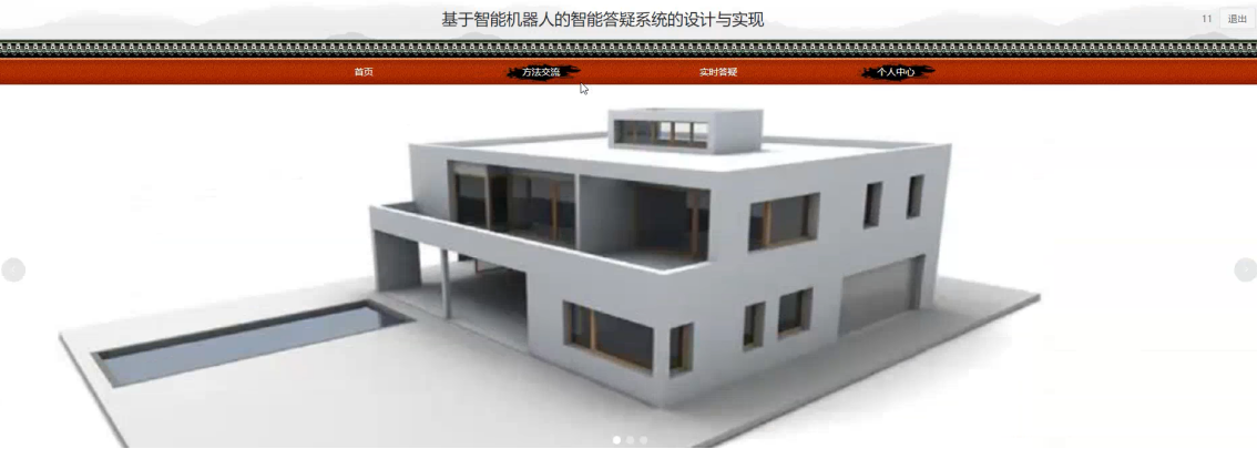 当游客打开系统的网址后,首先看到的就是首页界面。在这里,游客能够看到智能机器人的智能答疑系统的导航条显示首页、方法交流、实时答疑、个人中心等,系统首页界面如图5-1所示: