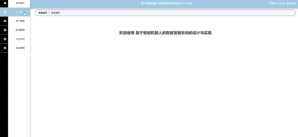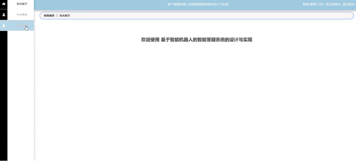 转人工智能后,页面会跳转到教师主页面,主要包括对统首页、个人中心、系统管理等进行操作。教师主页面如图5-12所示: