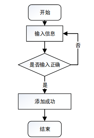 然后是添加信息的页面。进入该页面后,页面会出现一个提示框,示意操作者可以进行信息的添加,从而进行下一步的操作。用户输入想要添加的信息后提交,系统会对输入的内容进行检测。如果检测后输入的信息正确,则会出现“添加成功”的提示框,从而可以进行下一步操作;如果系统检测后检测到想要添加的信息不符合规范要求,则会提示报错,需要进行修改后重新添加。添加信息流程图如图3-2所示: