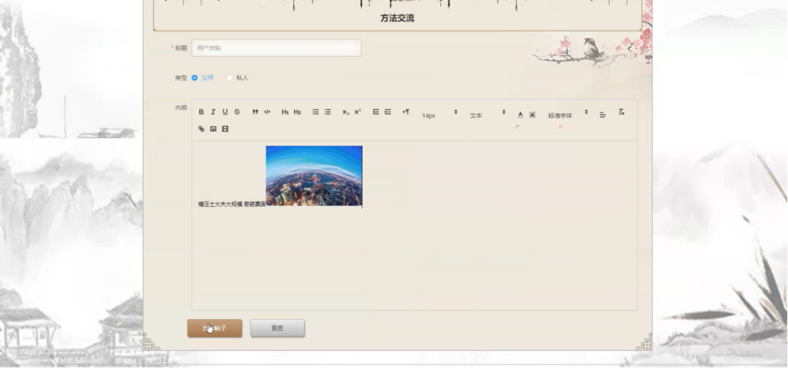 方法交流,用户进入到方法交流界面,通过界面进行编辑填写标题、选择类型、填写内容,以及选择公开或者私人,进行发布,也可以查看他人帖子进行评论,用户与教师之间互相交流,如图5-3所示: