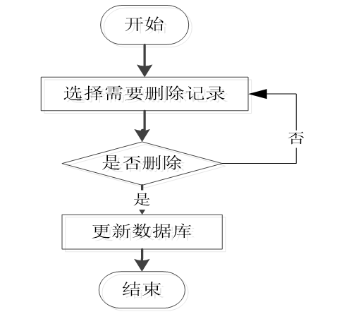 最后为删除信息页面。进入该页面后,用户可以对所要删除的信息进行选择,选择好删除的内容后,会有一个“是否确认删除”的提示框,操作者可以根据自己的意愿来选择“是”或“否”。完成上述操作,系统会自动的对删除的内容进行判断,如果符合删除要求则会成功删除数据记录,并且更新数据库的内容信息;如果删除的数据记录不符合要求,则会有一个“删除失败”的提示框,操作人员需要根据提示来进行修改,修改完成后重新删除知道删除成功。删除信息流程图如图3-3所示: