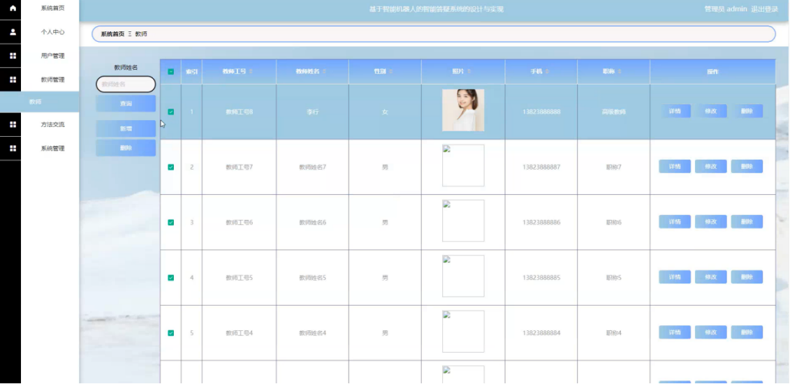 管理员点击教师管理,在教师管理页面中输入教师工号、教师姓名、性别、照片、手机、职称等信息,进行查询、新增或删除教师信息等操作。如图5-9所示:
