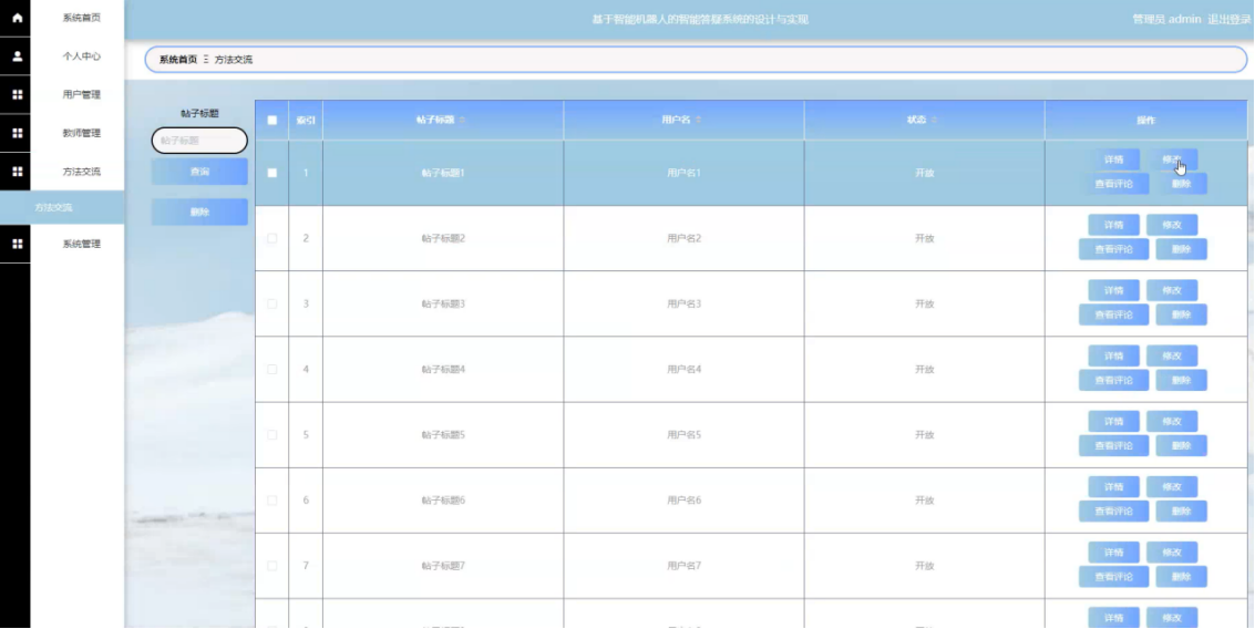 管理员点击方法交流,在方法交流页面中对帖子标题、用户名、状态等信息,进行查询、新增或删除方法交流等操作。如图5-10所示: