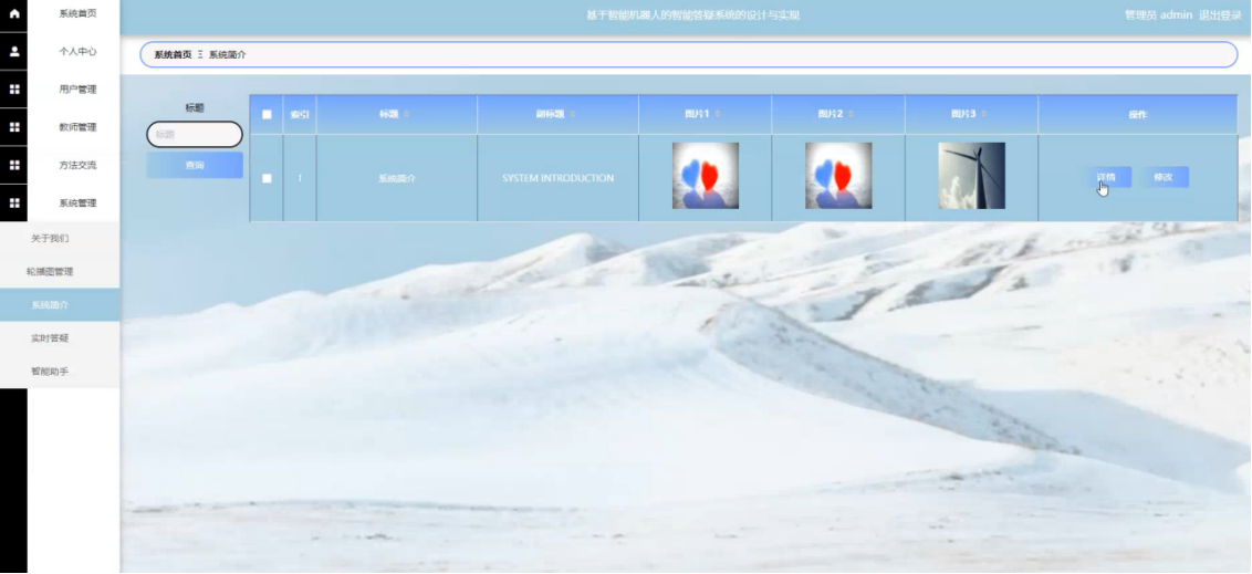 管理员点击系统管理,在系统管理页面中对关于我们、轮播图管理、系统简介、实时答疑、智能助手等信息,进行查询或修改系统信息等操作。如图5-11所示: