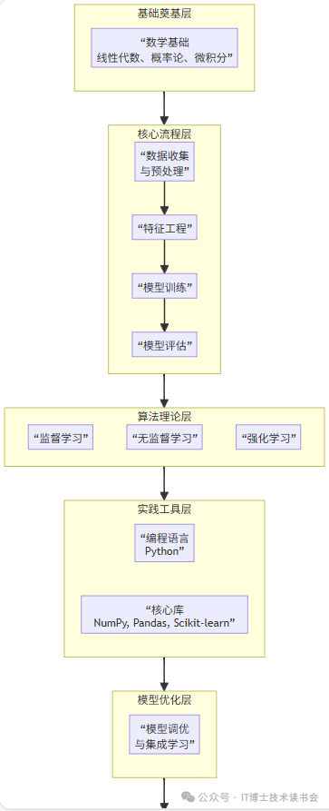 要系统掌握机器学习,需要遵循一个从理论到实践,从基础到应用的完整路径。其知识体系可以概括为下图所示的六个层次: