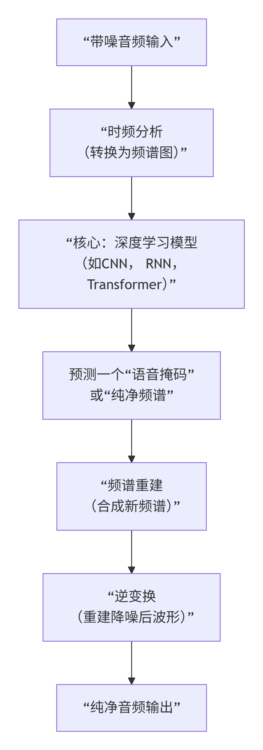 这是目前最先进、效果最好的方法,核心是使用深度神经网络 来学习“如何从带噪音频中恢复纯净语音”。