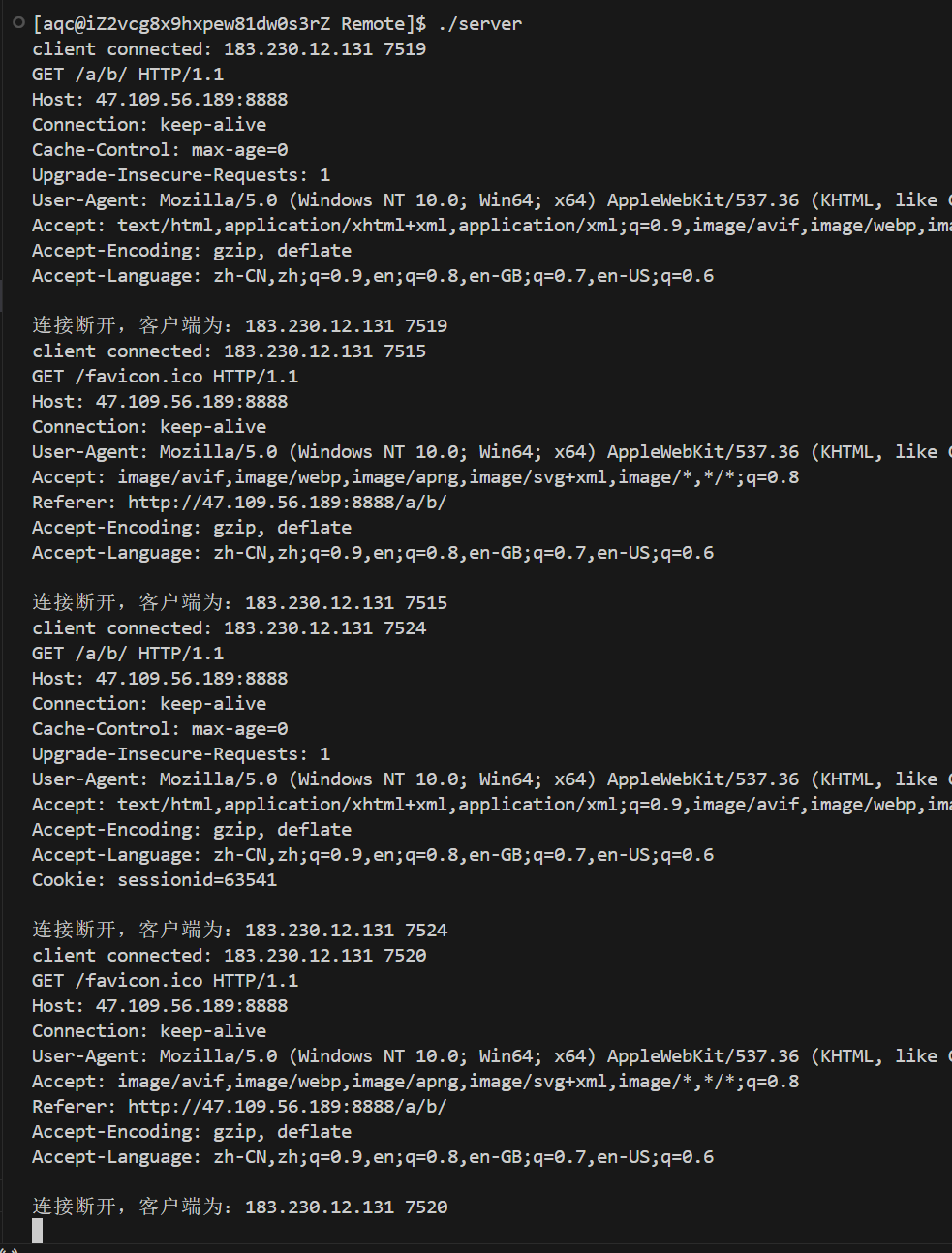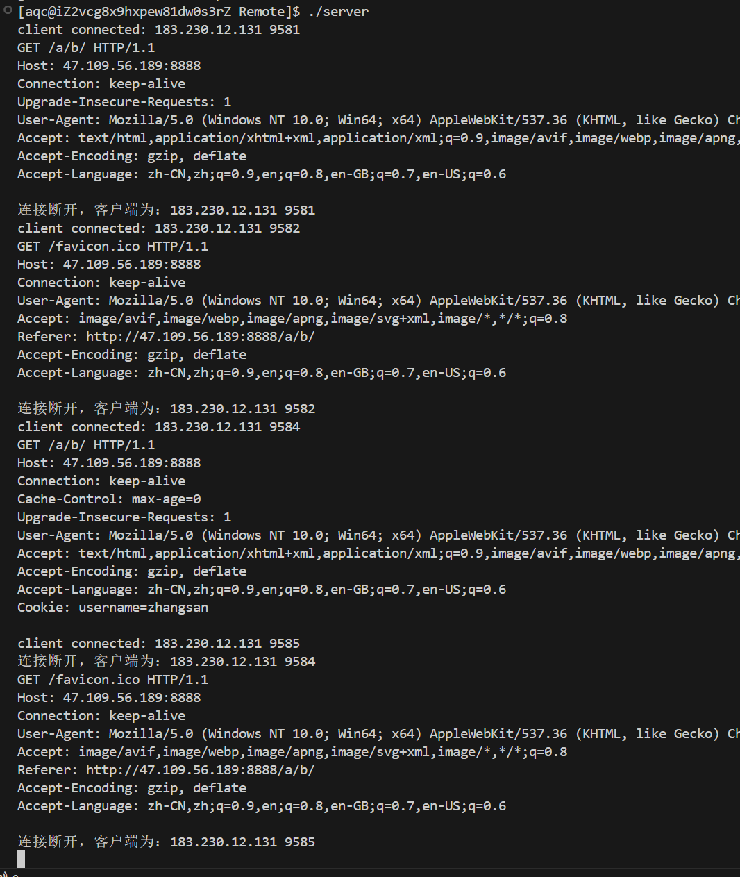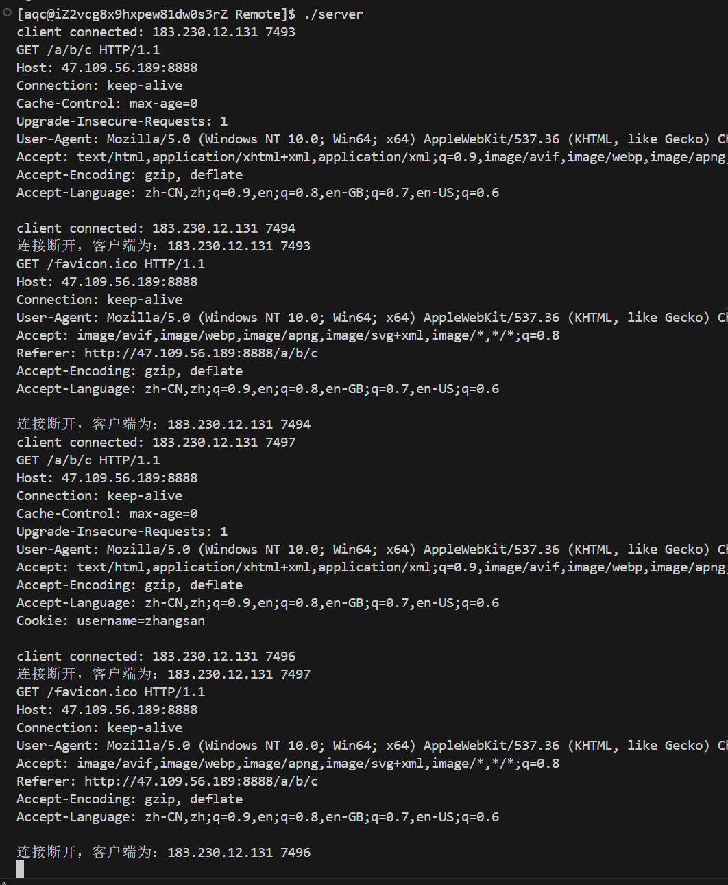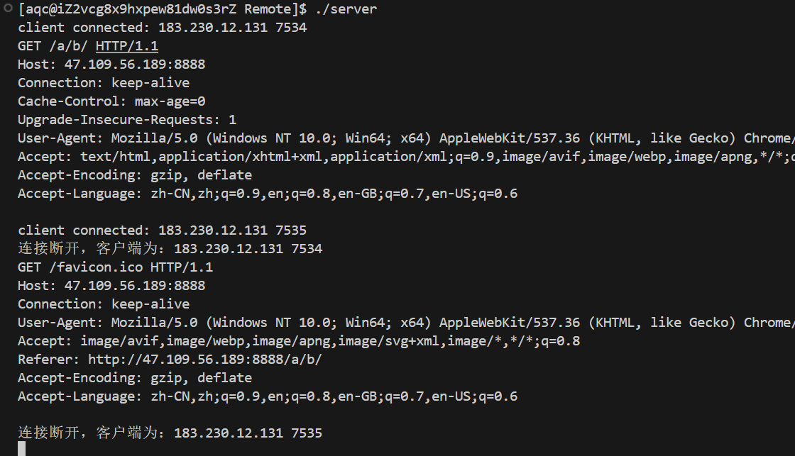 cout << "连接断开,客户端为:" << inet_ntoa(peer.sin_addr) << " " << ntohs(peer.sin_port) << endl;