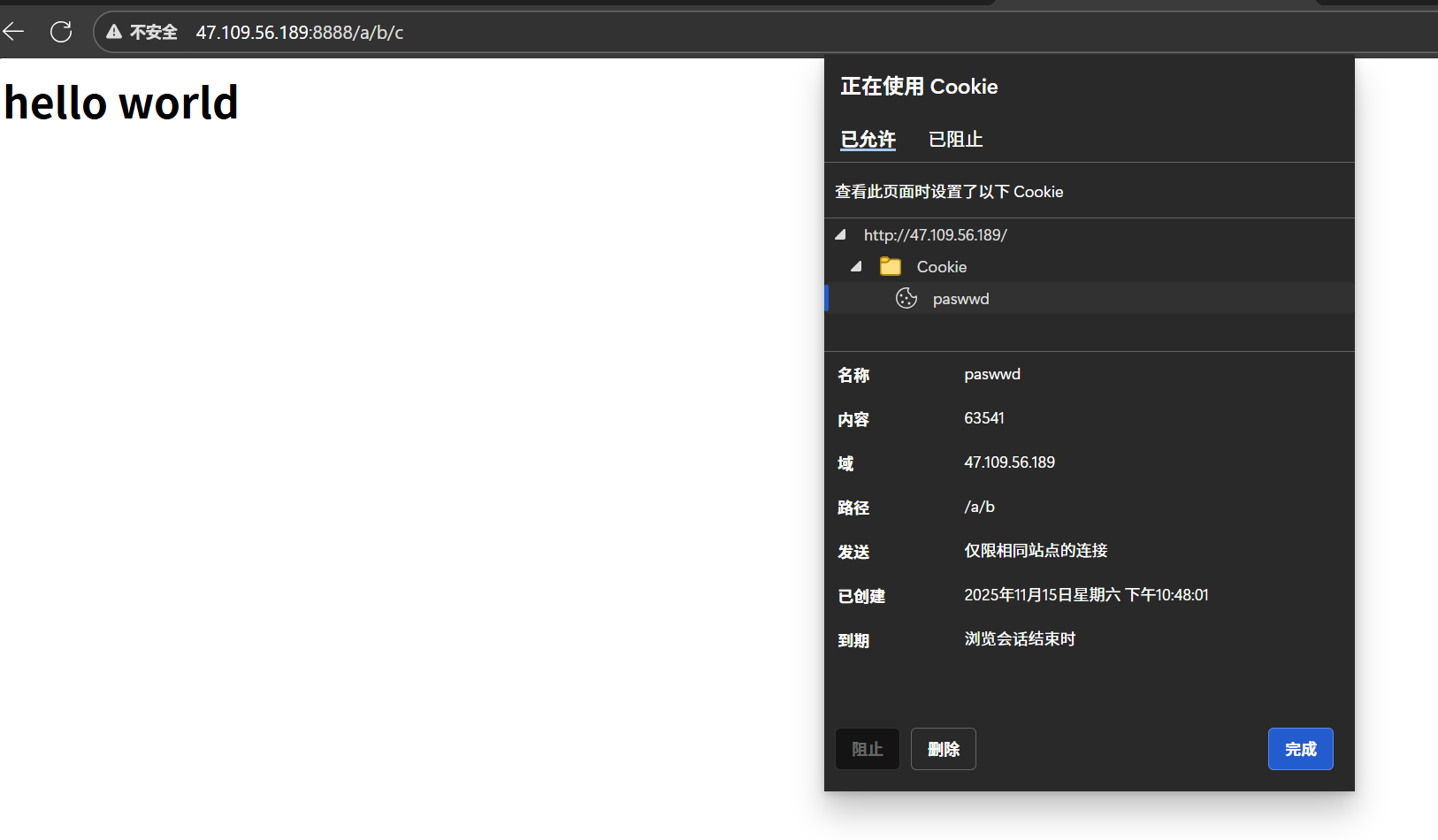 sprintf(buffer, "HTTP/1.0 200 OK\r\nContent-Length:%lu\r\nSet-Cookie: paswwd=63541; username=aqc; path=/a/b;\r\n\r\n%s", strlen(hello), hello);