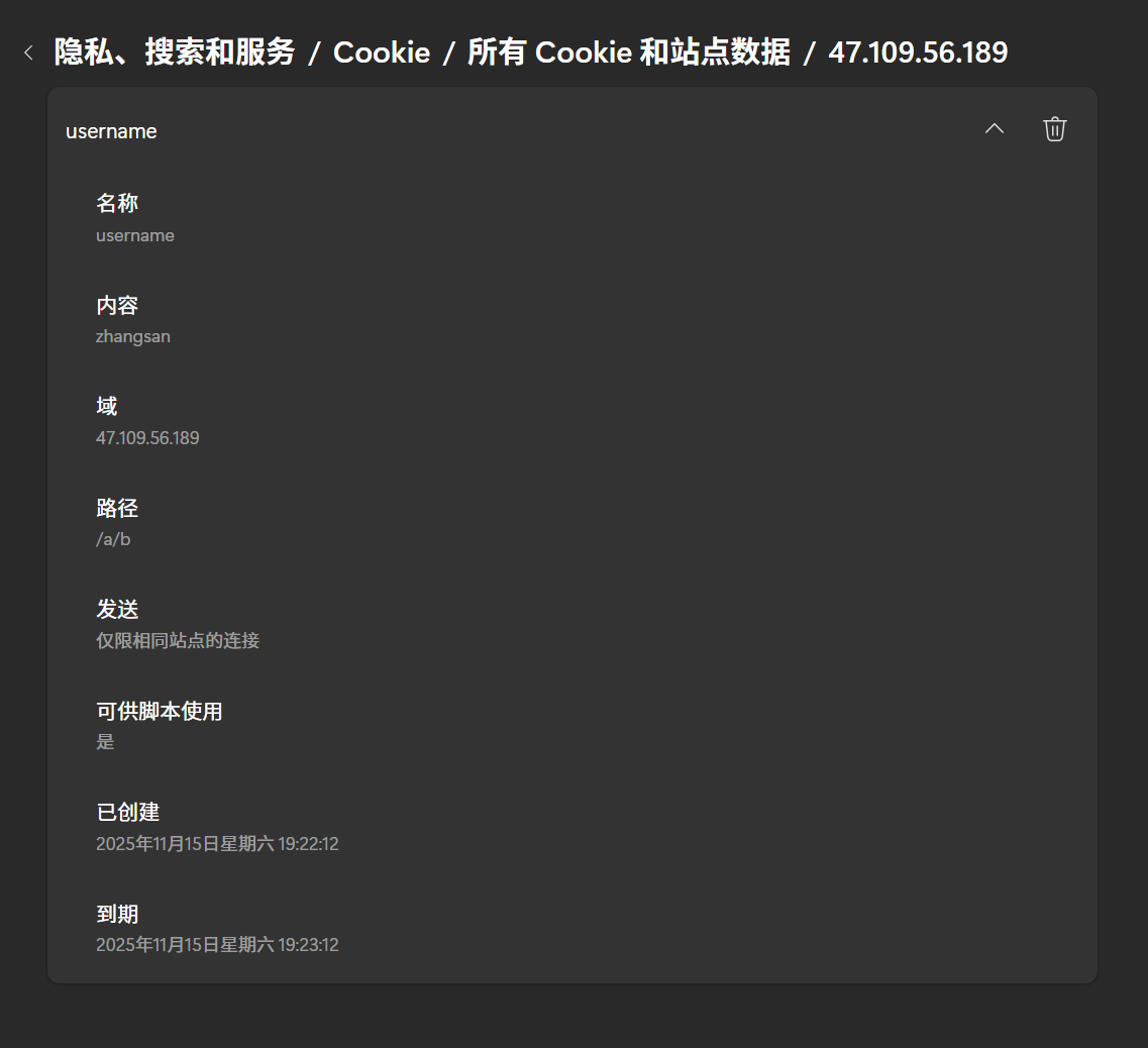 1.username指明用户,expires是该持久cookie的失效时间,path和domain作为限制,只有url请求的是该路径的文件或子目录、发送的是特定的域名,那浏览器进程才会在http报头的选项中加上cookie。如果设置了secure,那么只有https请求,才会加上cookie,http就不行了2.Cookie中每个属性都以分号(;)和空格( )分隔, 属性的名称和值之间使用等号(=