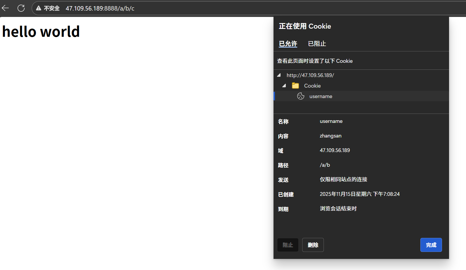 sprintf(buffer, "HTTP/1.0 200 OK\r\nContent-Length:%lu\r\nSet-Cookie: username=zhangsan; path=/a/b\r\n\r\n%s", strlen(hello), hello);