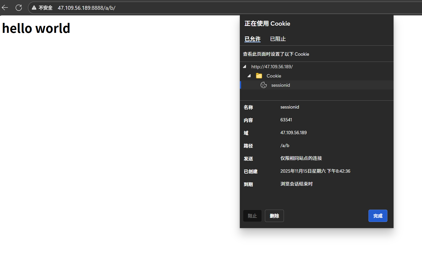 sprintf(buffer, "HTTP/1.0 200 OK\r\nContent-Length:%lu\r\nSet-Cookie: sessionid=63541; path=/a/b;\r\n\r\n%s", strlen(hello), hello);