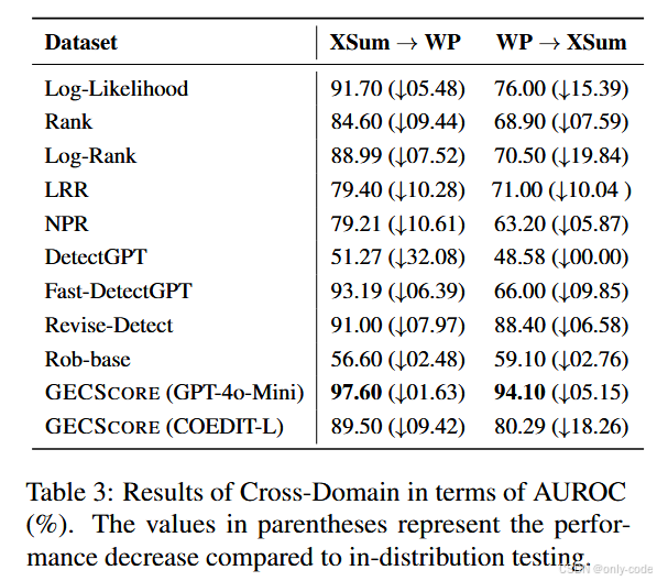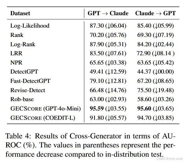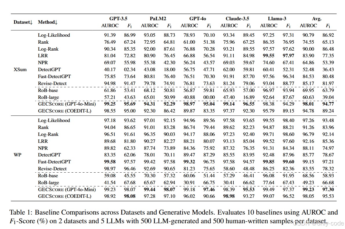 Fast-DetectGPT 的表现本来就很强(平均 AUROC 99.15%),但 GECSCORE(GPT-4o-mini)的平均 AUROC 也达到了 99.23%,F1 为 97.30%,几乎不相上下。 -