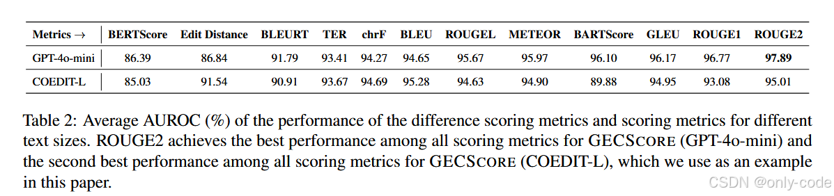 综合来看,ROUGE-2 是最稳的一项,GPT-4o-mini 下平均 AUROC 约 97.89%,COEDIT-L 下也有 95.01%。chrF、BLEU、TER、ROUGE-L 等也表现良好,但稳定性略逊。 -