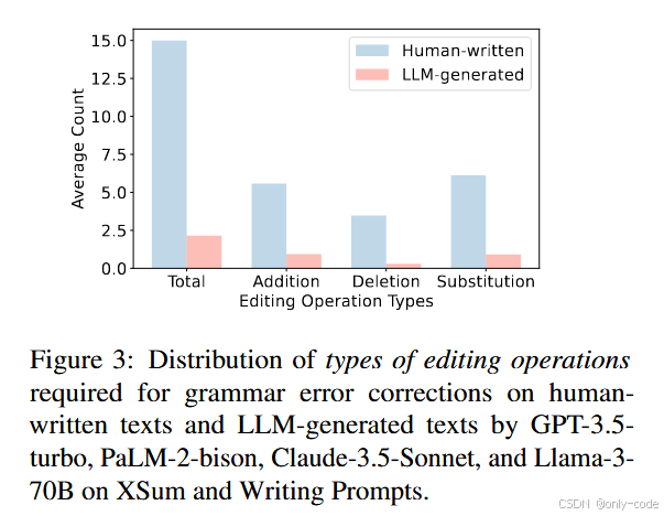 LLM 文本需要的增删操作更少,说明它们整体结构更合理,句子边界更清晰;