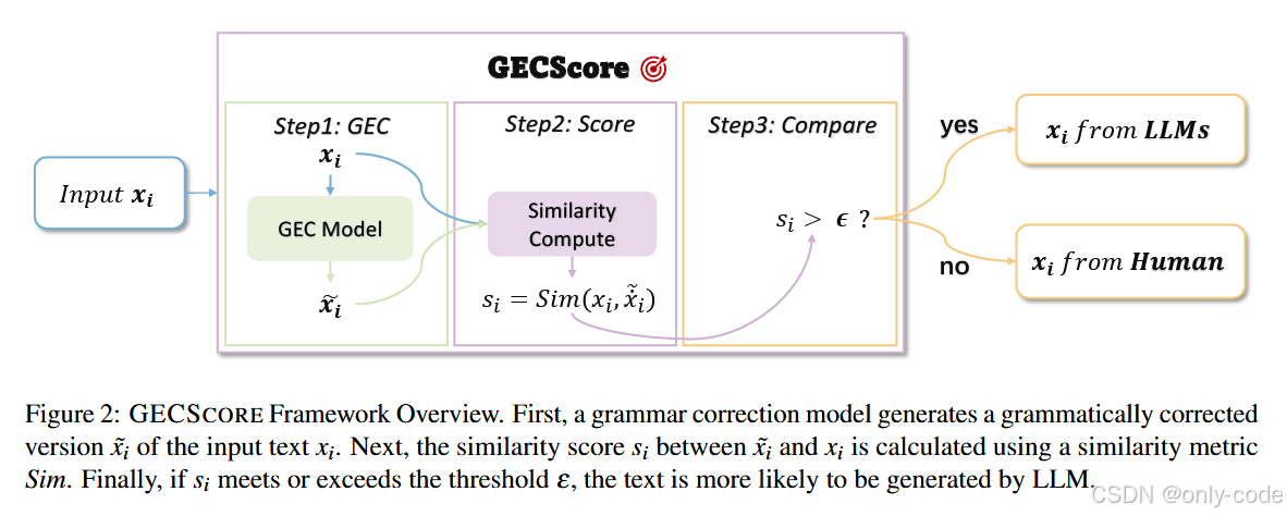 有了这些概念,再看 GECSCORE 的思路就会自然很多:先让一个 GEC 模型“出手改一改”,再看它改得多还是少——改得少,更像是 LLM 自己写的;改得多,更像是人写的。