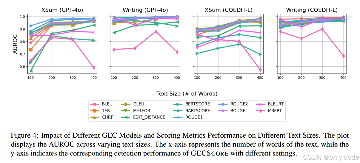 最后,他们还做了比较细致的消融实验:探索了不同相似度指标、不同 GEC 模型(GPT-4o-mini vs COEDIT-L)、不同文本长度对性能的影响,证明了 “语法错误差异”是主要驱动力,而“大模型的纠错偏好”则带来了额外增益。