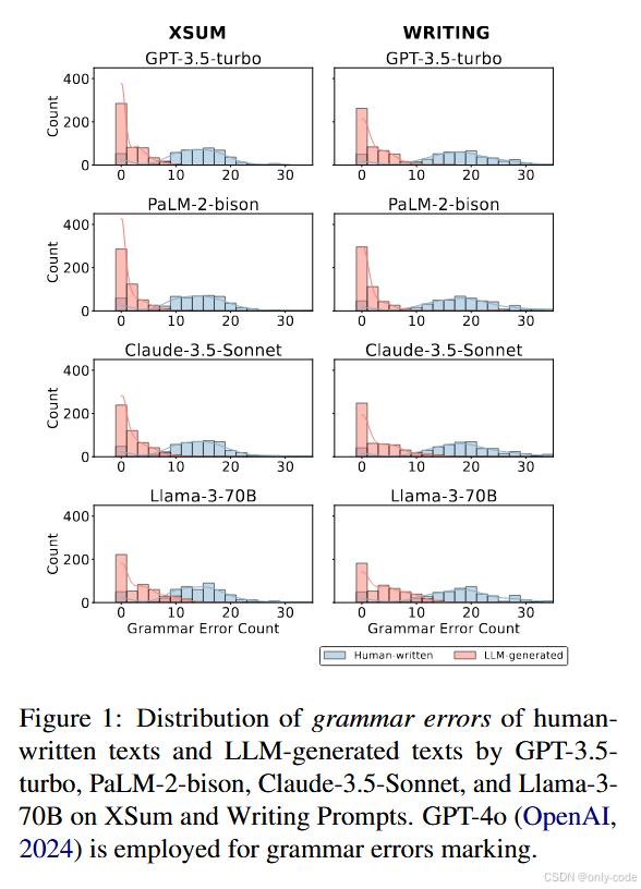 人类文本一般需要 10~30 个 语法修正,而 LLM 生成文本大多在 0~10 个,且大量样本接近 0。
