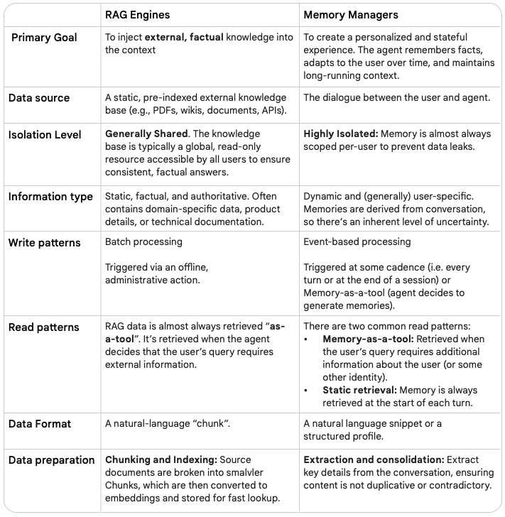 这是整篇白皮书中最重要的概念区分之一。记忆和 RAG(检索增强生成)都为 LLM 提供外部知识,但它们服务于完全不同且互补的目标。