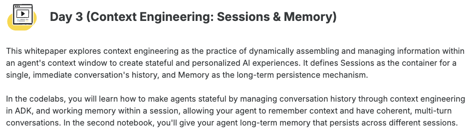 谷歌在第三天发布了《上下文工程:会话与记忆》(Context Engineering: Sessions & Memory) 白皮书。文中开篇指出,LLM模型本身是无状态的 (stateless)。如果要构建有状态的(stateful)和个性化的 AI,关键在于上下文工程。
