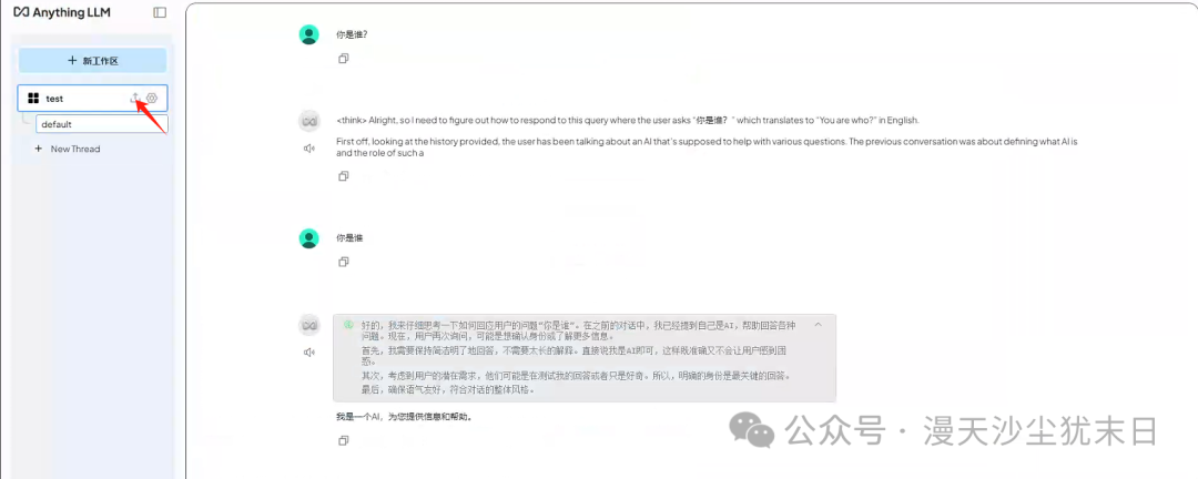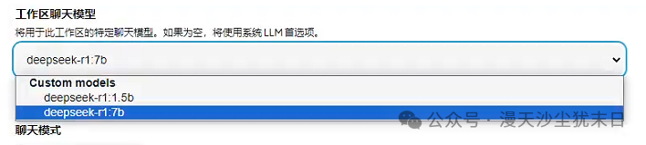 - 从LLM提供商中选择ollama,并从工作区聊天模型中选择ollama之前下载的大语言模型,这些选择deepseek-r1:7b。