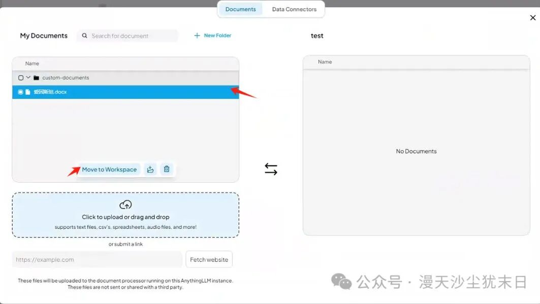 - 选中上传后的文件,点击Move to Workspace,将文件上传到工作区(右边的方框)。
