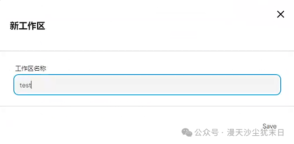 - 点击"+ 新工作区"创建新工作区,如命名为"test",点击save保存。