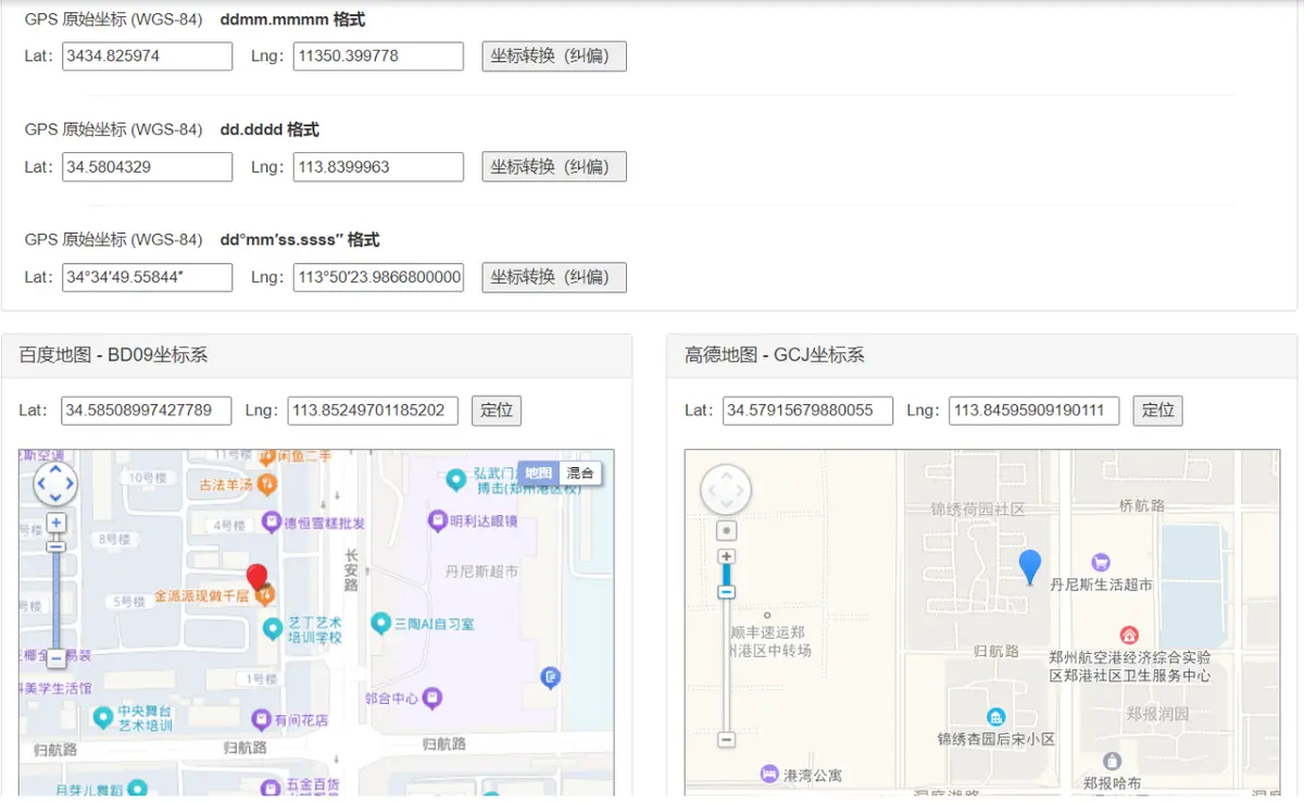 利用纠偏网站进行纠偏:合宙所有的 GNSS 功能的坐标系均使用国际标准 WGS-84 坐标系,所以开发者在国内常见地图定位时,会发现与实际情况有几十米的误差。这并非模块问题, 而是国内地图采用了非标坐标系所致。 国内常见地图如高德地图使用 GCJ-02 坐标系, 百度地图使用 BD-09 坐标系,故此开发者需要对模块输出的经纬度进行加偏处理,才能在国内的地图上实现精确定位。