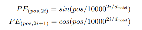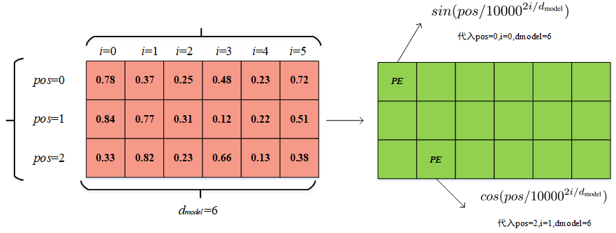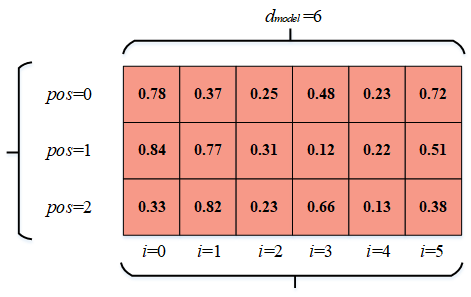 通过公式可以看到,每个位置的值计算方法是不同的,当i为偶数的时候,用的是sin函数;当i为奇数的时候,用的是cos函数,并且公式中有三个变量:pos、i以及dmodel。