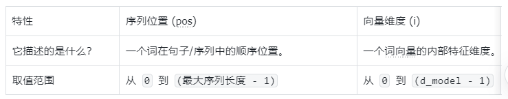 因此可以看出来pos其实就是每个词向量在词嵌入中的行坐标,i是列坐标,当然这么说挺不专业的,我们说: