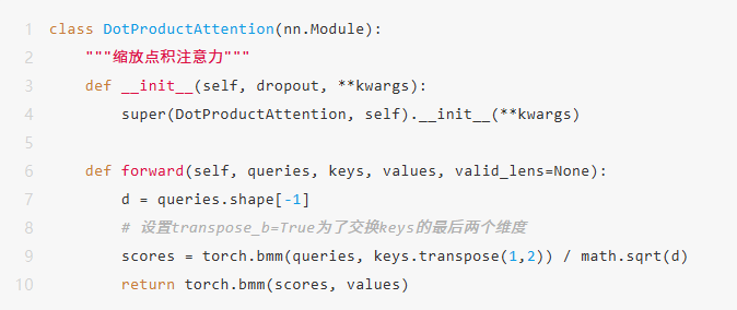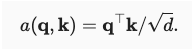 缩放点积注意力:该评分函数需要查询q和键k保持长度一致,其公式为: