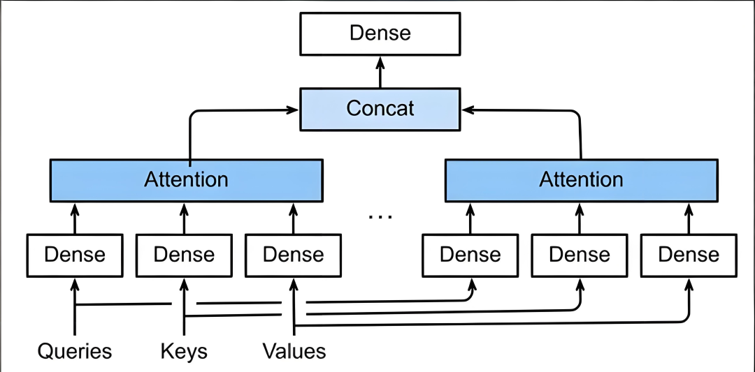 多头注意力机制就是将多个注意力汇聚的结果拼接在一起,这样得出来的结果会包含更多的行为信息,如下图所示: