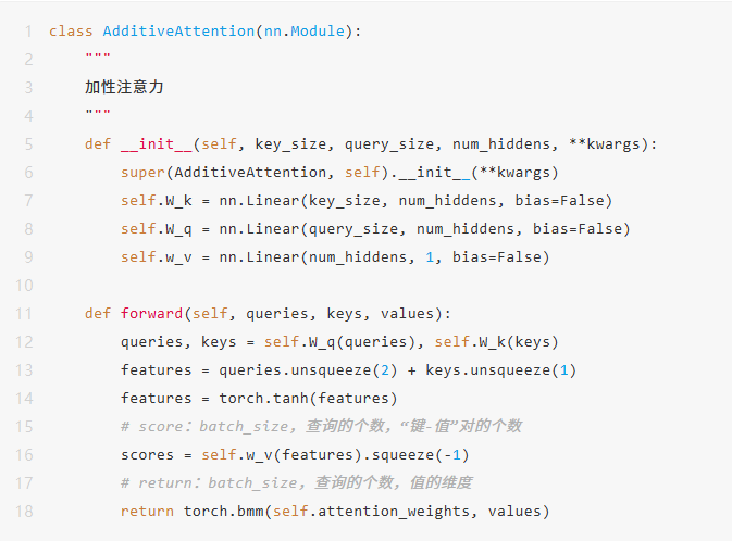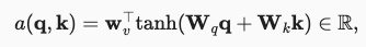 加性注意力:该评分函数不用考虑查询q和键k是否长度一致,其公式为: