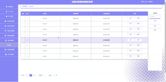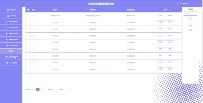 管理员点击承运商管理。在承运商页面输入承运商进行查询、新增或删除承运商列表,并根据需要对承运商详情信息进行修改或删除操作;如图5-6所示: