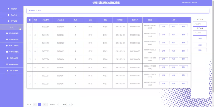 管理员点击员工管理。在员工页面输入员工工号和员工姓名进行查询、新增或删除员工列表,并根据需要对员工详情信息进行详情、修改或删除操作;如图5-3所示:
