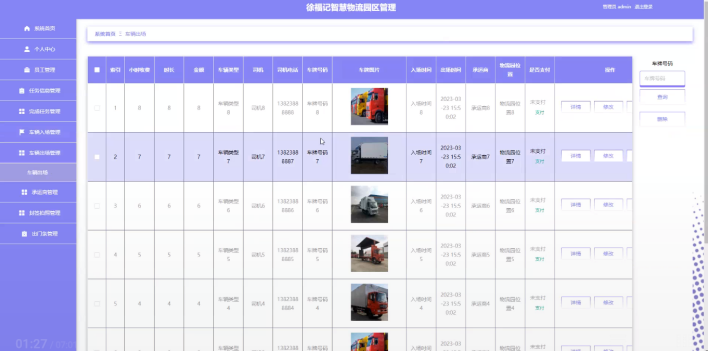 车辆入场管理(预约登记、车型/司机/电话、车牌图片、小时收费、承运商关联、物流园位置、入场时间、状态标记)