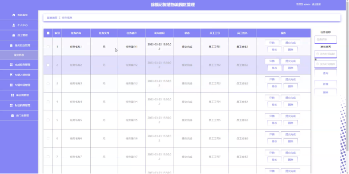 管理员点击任务信息管理。在任务信息面输入任务名称和发布时间进行查询、新增或删除任务信息列表,并根据需要对任务详情信息进行详情、提交完成、修改或删除操作;如图5-4所示:
