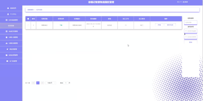 员工点击任务信息管理。在任务信息面输入任务名称和发布时间进行查询任务信息列表,并根据需要对任务详情信息进行详情或提交完成操作;如图5-10所示: