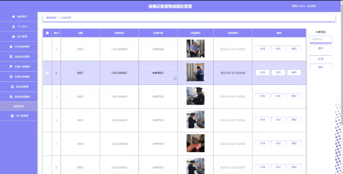 管理员点击封签拍照管理。在封签拍照页面输入车牌号码进行查询、新增或删除封签拍照列表,并根据需要对封签拍照详情信息进行详情、修改或删除操作;如图5-7所示: