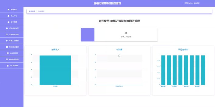 管理员进入主页面,主要功能包括对系统首页,个人中心,员工管理,任务信息管理,完成任务管理,车辆入场管理,车辆出场管理,承运商管理,封签拍照管理,出门条管理等进行操作。管理员主页面如图5-2所示: