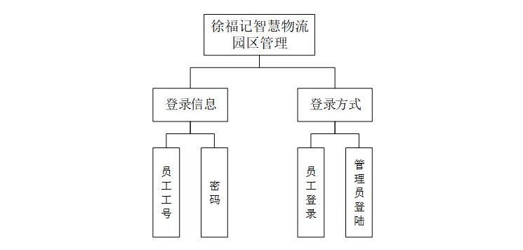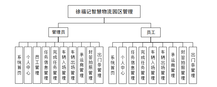 管理员模块属于是系统的后台,进入之后有大量的管理员功能,管理员也可以使用员工模块的功能,为了维护系统的稳定与页面的布局,将管理员模块的功能详细化后可以使用系统管理对页面进行布局修改,员工模块可以修改个人信息,对车辆入场和车辆出场信息等进行查询,修改或删除等,徐福记智慧物流园区管理系统总体结构图如图4-2所示。