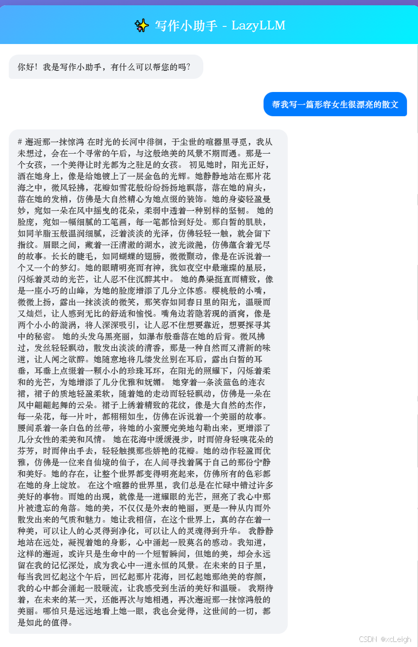 LazyLLM 写作助手 Agent 为论文、专栏、公众号文章等内容创作提供了极大的便利,能够帮助创作者快速生成初稿,提高创作效率。通过合理构建提示词、准确传达需求,结合人工的润色和优化,可以创作出高质量的内容。然而,目前的人工智能写作工具仍然存在一些局限性,需要我们在使用过程中不断探索和改进。未来,随着人工智能技术的不断发展和完善,相信 LazyLLM 写作助手 Agent 等工具将在内容创作领域发挥更加重要的作用,为我们带来更多的创作灵感和便利。希望本文的教程能够帮助你更好地使用 LazyLLM 写作助手 Agent,开启高效创作之旅。